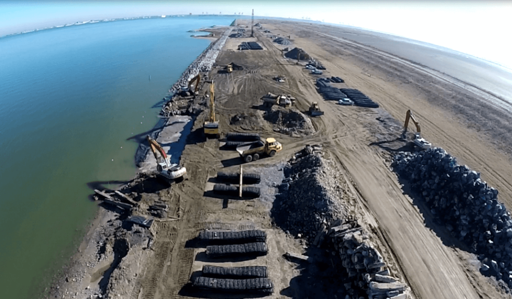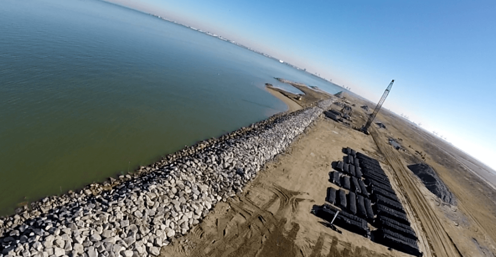 The contractor shall provide the materials and equipment necessary to construct 8 breakwaters as shown and described in the plans and specifications. To the maximum extent possible, the existing concrete shall be used as a bedding layer for the armor stone. Geotextile filter material shall be used under all areas of bedding material. All construction borrow areas and haul routes must be coordinated with the COR. All disturbed areas shall be seeded with a site-specific, low-maintenance permanent seed mixture. Disposal of suitable excess excavated material shall be coordinated with the COR. The installation shall provide adequate space for the delivery and storage of equipment and materials.