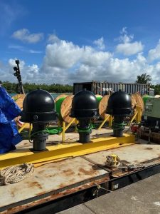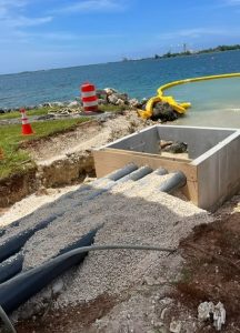 Installation of a new UEMMS array consisting of 22 – 12” diameter 20-foot long FRP sensor tubes; concrete anchor discs and PVC pipe anchors from Array to Shore Transition; linear array of twenty-two sensors: 13 combination electro-magnetic triaxial (EMT) sensors, 8 triaxial magnetometers (MT) and 1 conductivity, temperature, and depth (CTD) sensor. The EMT and MT sensors were installed in a straight line to specification and spaced on 20-ft centers. In addition, we installed four spare cables (2 EMT and 2 MT) within the array area. The array was centered on and aligned perpendicular to the navigation channel. The sensor cables were routed from the array along the seafloor to the shore landing location, where we installed a new, below-grade transition vault to transition the sensor cables to a dry, secure box located onshore at Polaris Point. Once onshore, the cables were connected to the data acquisition equipment located in the Force Protection Tower at Polaris Point.