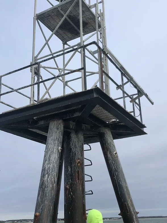 Installation of 2 range lights and demolition of 1 range light tower. Each new tower consisted of the installation of 1 each 18” diameter plumb pile and 3 each 12” diameter batter piles. The piles were installed using a permanent steel template. The piles were approximately 60’ long, and the water depths ranged from 15 to 20 feet at the project site. Our scope consisted of blasting and coating the towers with a 3-layer epoxy paint system and the installation of platforms and towers over the piles. Precon performed this work using a 135’ x 55’ barge and a 200-ton crane.