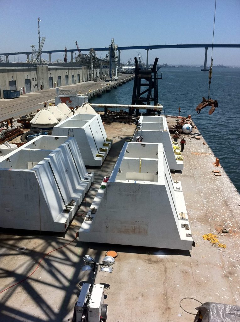 This project involved constructing, transporting, and installing a precast concrete caisson over the existing FRP piles and positioning the caisson structure on the seafloor. The caisson was constructed using low magnetic permeability concrete and fiberglass reinforcing. A stone leveling base, consisting of clean washed cobbles, shall be installed prior to the concrete caisson being lowered into the water. Eight concrete pipe sleeves shall be lowered over the existing piles and grouted in place using non-shrink cementitious grout. The caisson shall be filled with cobblestones, followed by the placement of a precast concrete cap on top of the concrete caisson. The concrete cap shall be secured in position by dowels and grout. Scour mats shall be installed in places around the perimeter of the structure to prevent undermining. Fiberglass cable raceways shall be installed on the 3 scour mats, caisson, and pipe sleeve, followed by the installation of the government-furnished junction box, sensors, and sensor cables. Upon completion of the caisson, pipe sleeve, scour mat, and sensor installation, the Navy will conduct tests and validate the sensor array.
