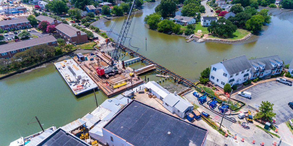 The work completed consisted of the replacement of the Bridge Street Bridge over Salters Creek, with a new bridge structure. The work generally consisted of replacing the existing bridge with a new 215’ long bridge, and reconstructing 150 feet of approach roadway. The major items of work were dismantling and removal of the existing bridge, reconstruction of roadway approaches to include pavement, concrete curbing, and sidewalk, provision of a temporary utility bridge for bridge utilities to remain operational during construction, provision of storm, sanitary, water, electrical, and communication installations, and placement of rip-rap slope protection.