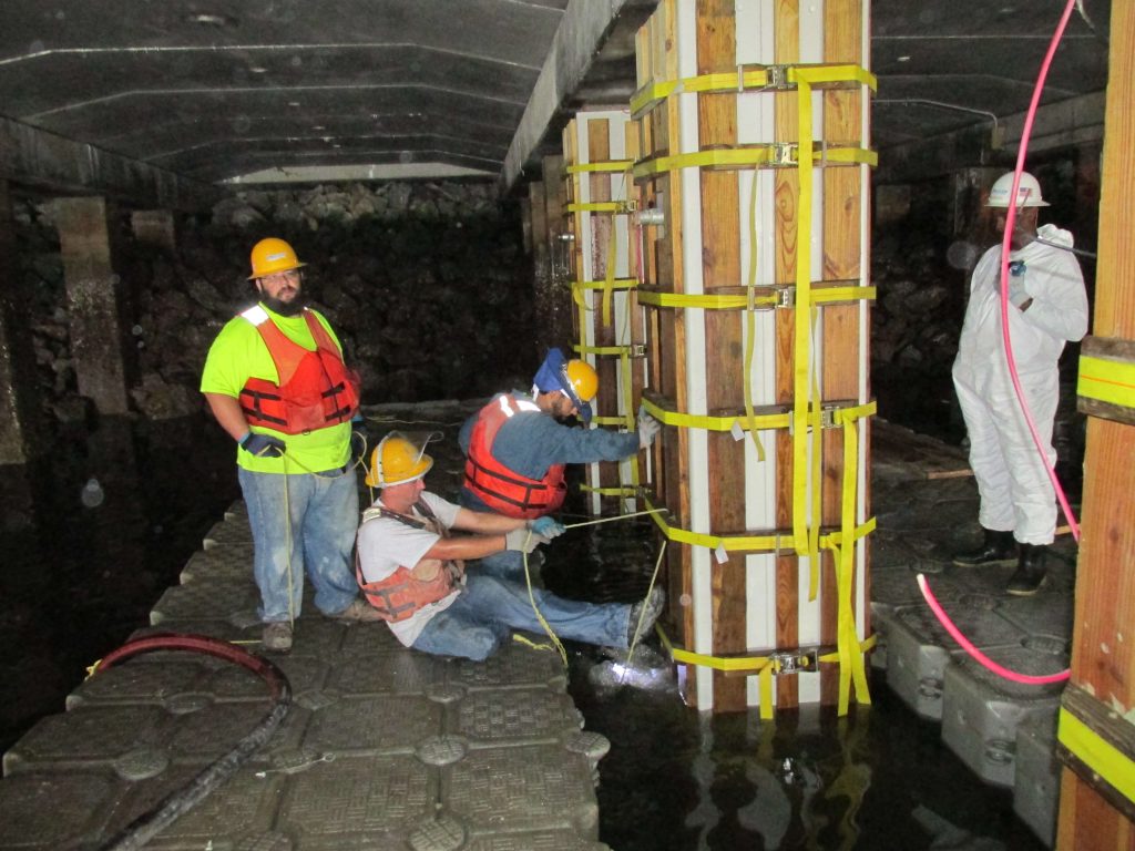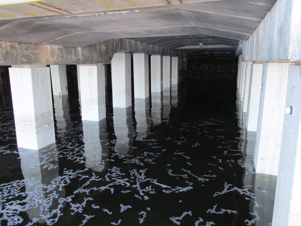 The work performed provided reinforced concrete repairs on piles, pile caps, bull rails, and edge beams; installation of an impressed current cathodic protection system on reinforced concrete pile caps; installation of anodes and a bonding harness system on steel fender piles and camel guide piles; cleaning, coating, and installation of fender wraps to steel fender piles; and cleaning and coating of steel camel guide piles.